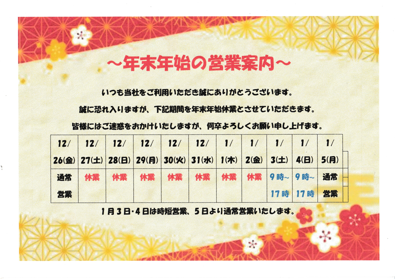 (株)男衾自動車では誠に勝手ながら、下記期間を年末年始休業とさせていただきます。