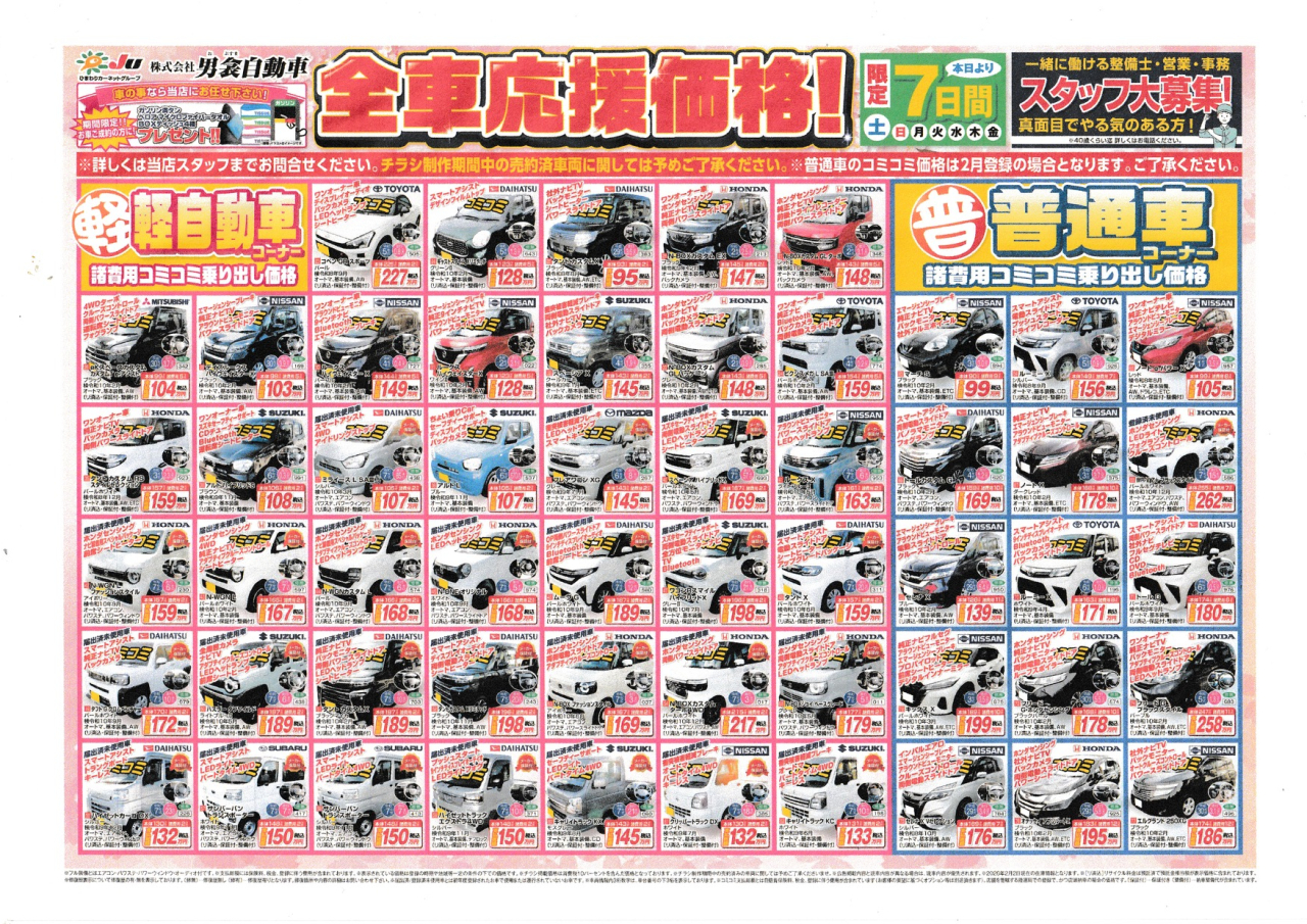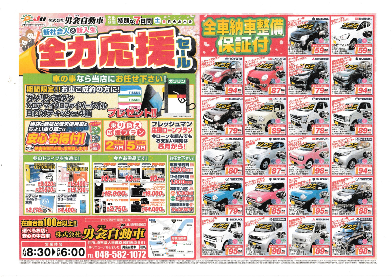 4月から社会人になる方、大学や専門学校に通う方などなど春は新しいことが始まる季節です。そこで、これからお車が必要になる皆様に少しでもお力になれればと思い、微力ではございますが応援セールを実施いたします